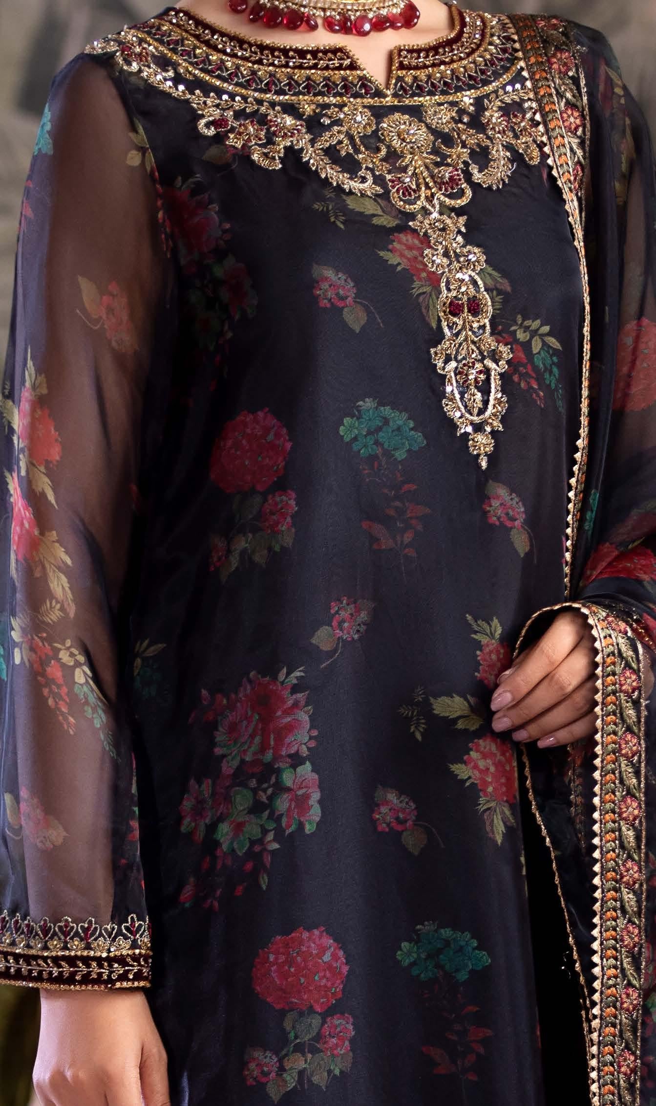 Organza Printed Shirt with embroidered front neckline,embroidered sleeves and daman lace.