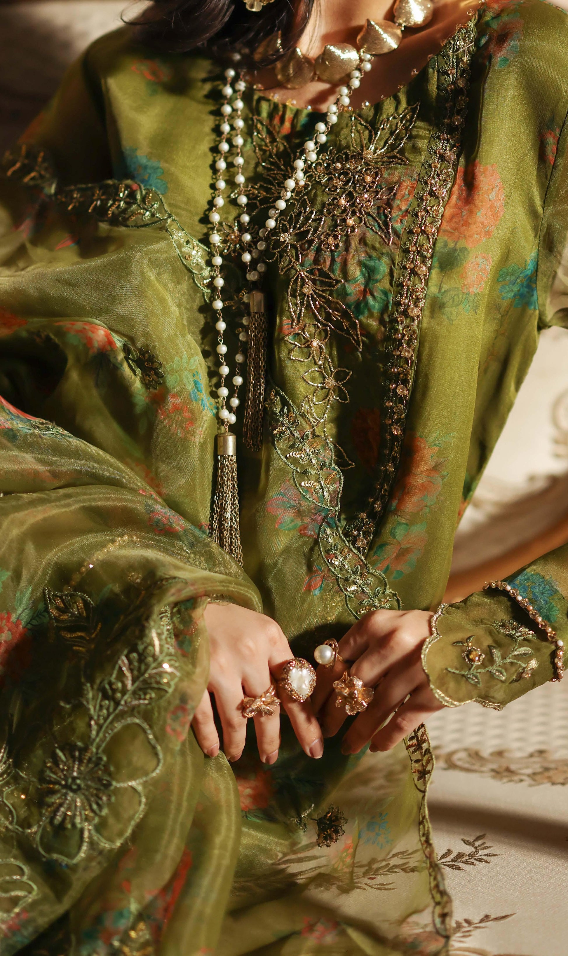 Organza Printed Shirt with embroidered front motif,embroidered sleeves motif and embroidered front back laces.