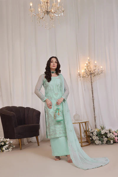 This luxury embroidered chiffon suit features intricate embroidery and includes a matching chiffon dupatta. Exquisitely designed and crafted, this 3-piece suit is perfect for special occasions and will elevate any wardrobe. Make a statement with this high-end, stylish suit. with sequins Elevate your wardrobe with the timeless elegance of intricate embroidery and luxurious chiffon. Made with high-quality materials, this 3-piece suit is perfect for special occasions. The matching dupatta adds an extra touch of sophistication. With its stunning design and attention to detail, this suit will make a lasting impression. And don't forget the added sparkle from the delicate sequins.