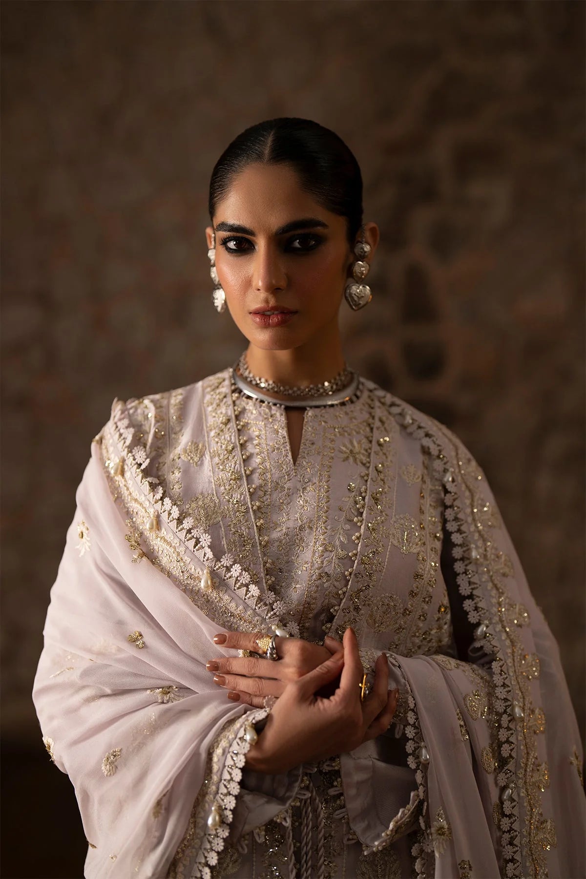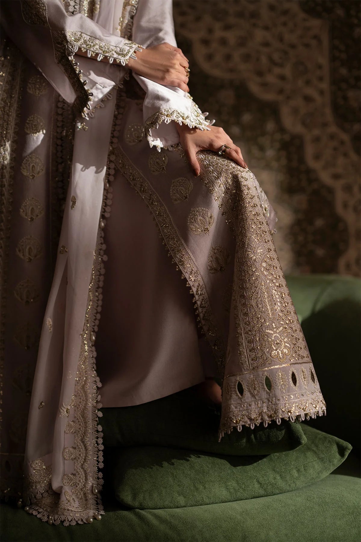 Introducing our elegant pastel purple open gown-style shirt, adorned with beautiful embroidery for a touch of sophistication. Paired with a chic inner shirt, flowing chiffon dupatta, and stylish azaar pants, this outfit is perfect for festive occasions, combining traditional charm with modern flair.