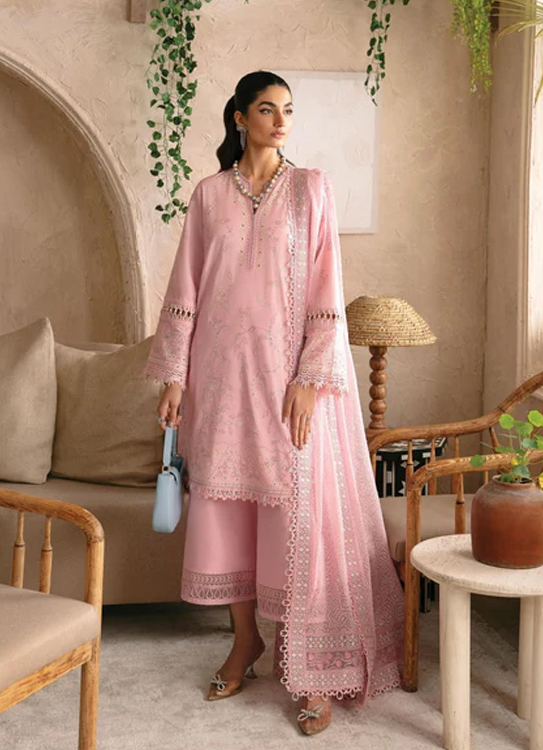 Additional Description: ELLA IS A PINK GRACE LAWN SHIRT THAT EXUDES TIMELESS CHARM. IT IS MADE OF A BREEZY LAWN FABRIC, BRILLIANTLY EMBROIDERED IN FOUR COLOURS. PAIRED WITH MATCHING TROUSERS AND A COORDINATING BLOCK-PRINTED CHIFFON DUPATTA, THIS ENSEMBLE EXUDES FLAIR AND BEAUTY, MAKING IT THE PERFECT CHOICE FOR A TOUCH OF ELEGANCE AT ANY CELEBRATION.