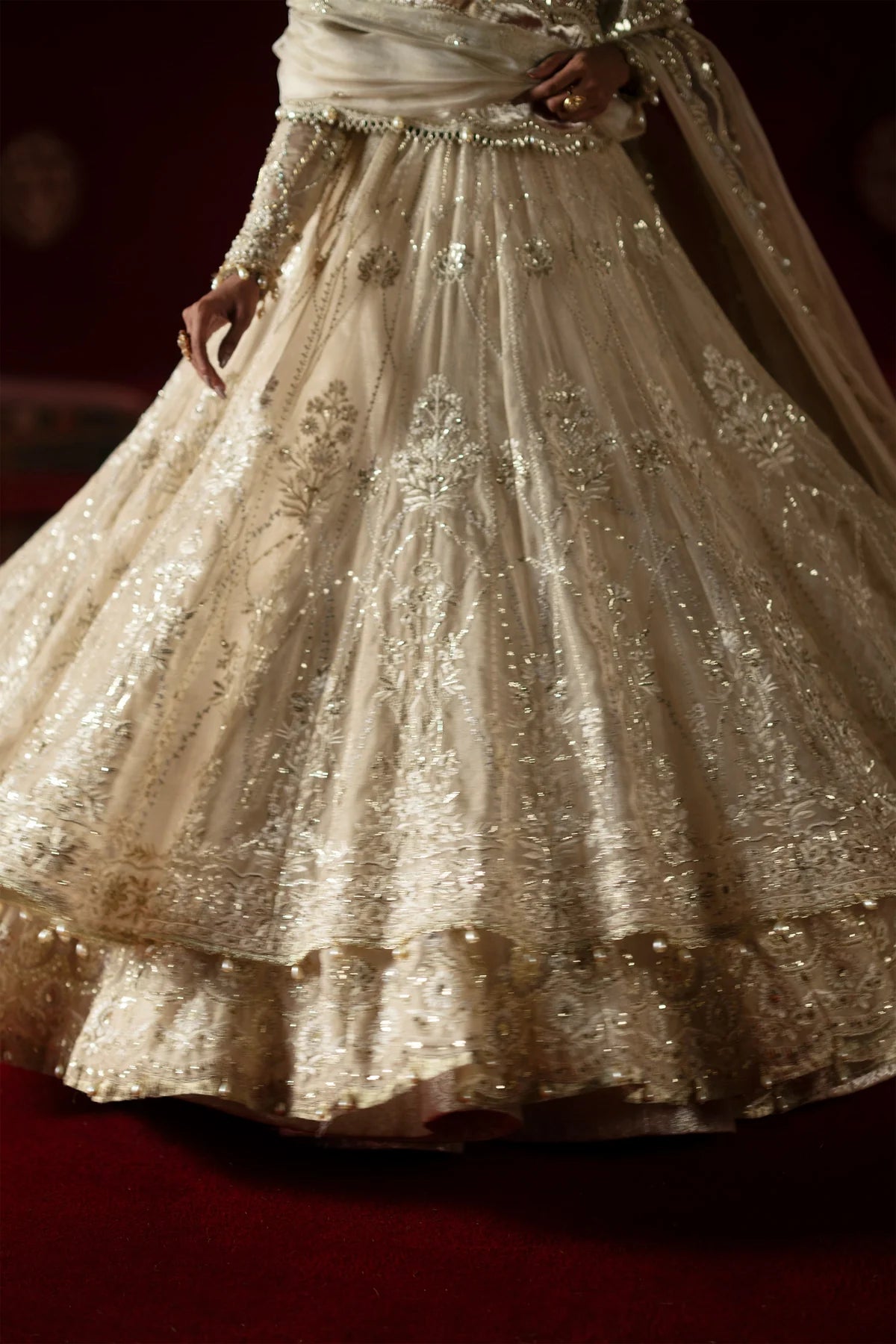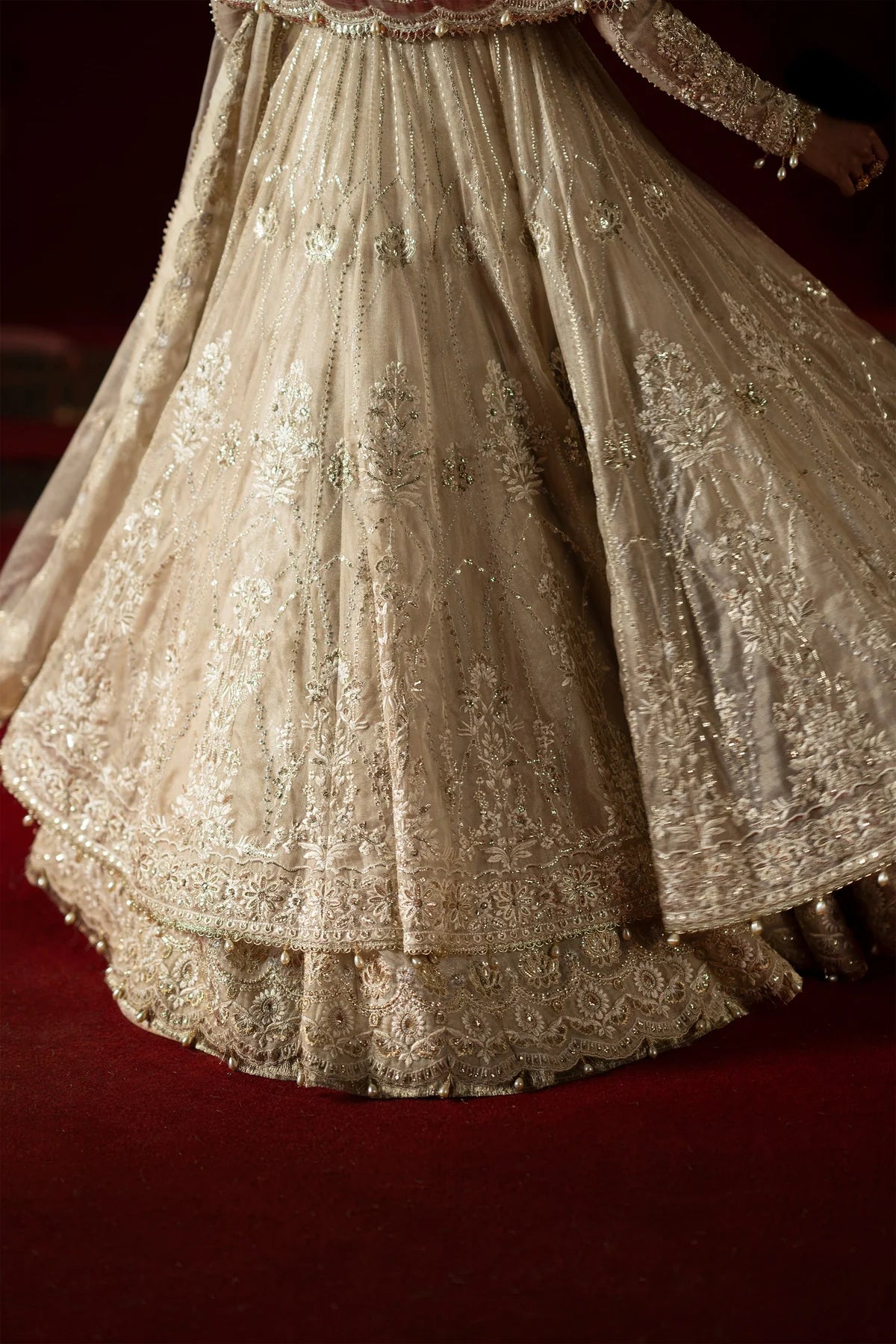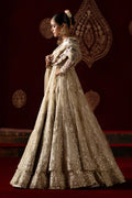 An opulent gold chanderi net tissue double-layered pishwas, adorned with intricate embroidery and delicate handwork details that exude timeless elegance. Paired with a regal jamawar lehnga and a graceful chanderi net dupatta, this ensemble is a perfect blend of tradition and luxury.