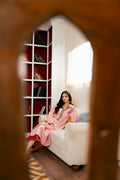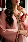 Fall in love with this enchanting combination of rose pink and light pink, designed to turn heads at every occasion. The short shirt features a hand-embellished neckline adorned with glimmering stones, Resham, sequins, and intricate naqshi detailing—an exquisite display of craftsmanship. Paired with rose pink culottes, also delicately hand-embellished, this outfit is the perfect blend of feminine charm and festive elegance.
