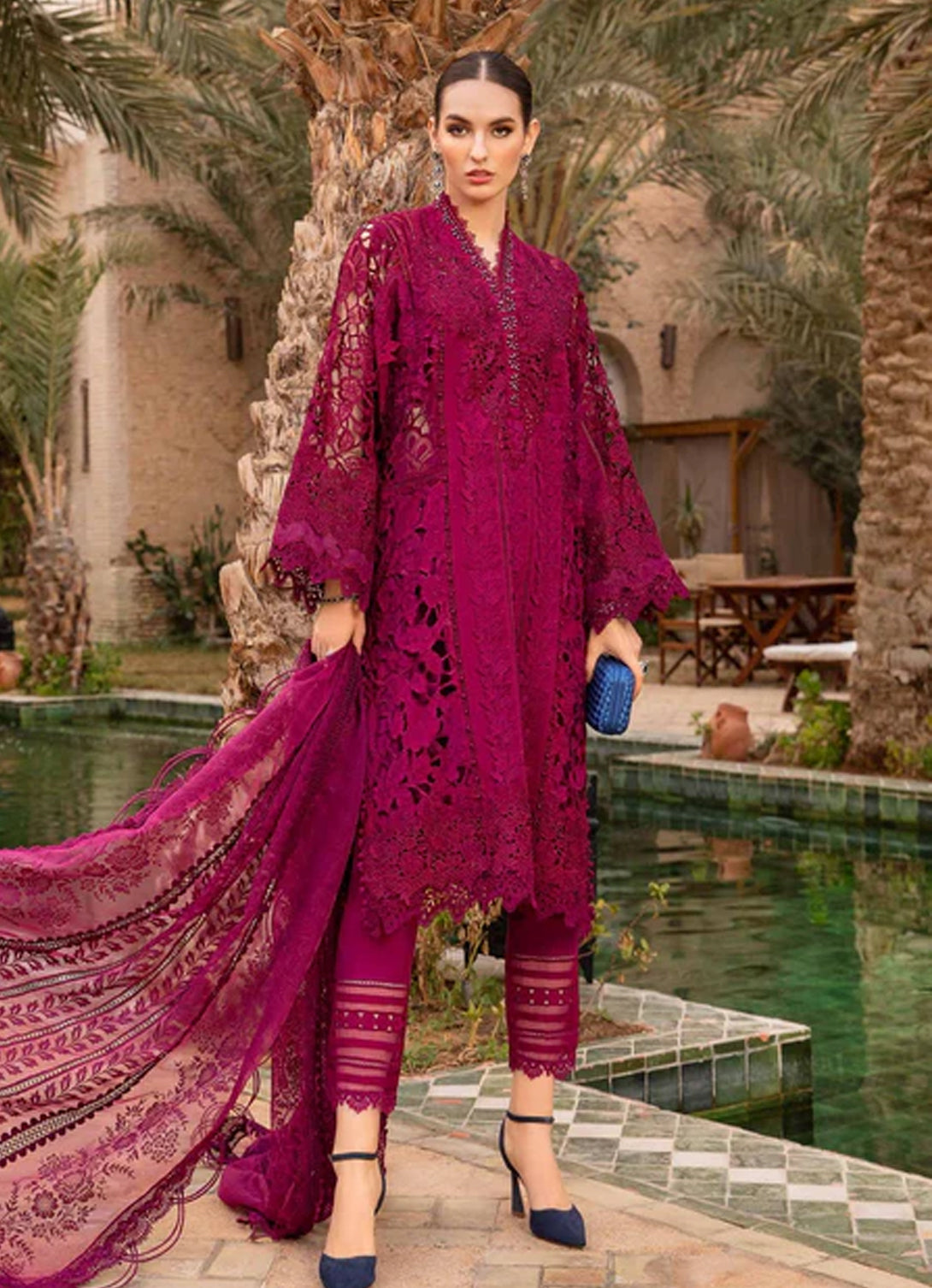 Shirt Embroidered Organza Neckline Patch With 3D Flowers & Pearls Embroidered Lawn Neck Patti With Pearls Dobby Lawn Center Front With 3D Lace Embroidered Lawn Side Panels Dobby Lawn Back & Sleeves Embroidered Lace For Sleeves Embroidered Sleeves Patch Embroidered Organza Sleeves & Side Panel Patches Embroidered Organza Ghera & Sleeves Patti With 3D Flowers Dupatta Poly Organza Burnout Dupatta Trousers Dyed Cambric Trouser Color: Magenta