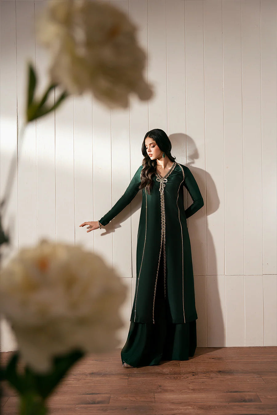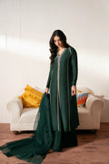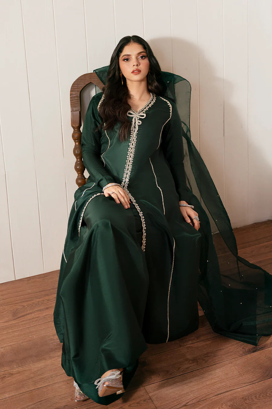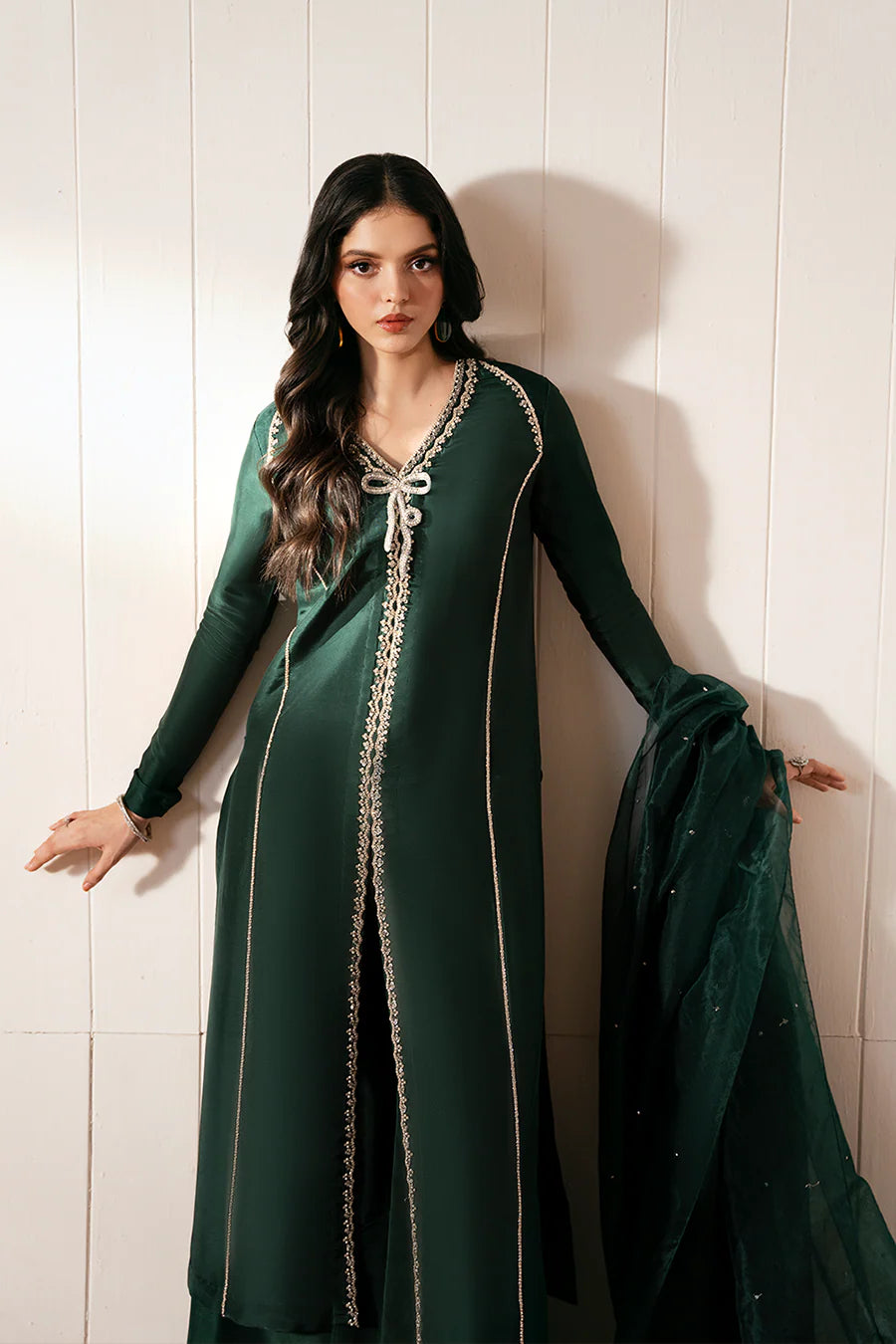 Elevate your festive wardrobe with this luxurious bottle green long shirt, featuring a unique and graceful bow-tie design that cascades elegantly down to the hem. Meticulously hand-embellished with sparkling stones, Swarovski crystals, and delicate pearls, this outfit exudes refined glamour. It is paired with matching long culottes and a sheer organza dupatta, completing the look with timeless sophistication—perfect for weddings, formal events, or special celebrations.