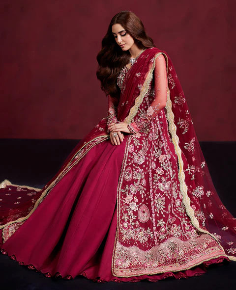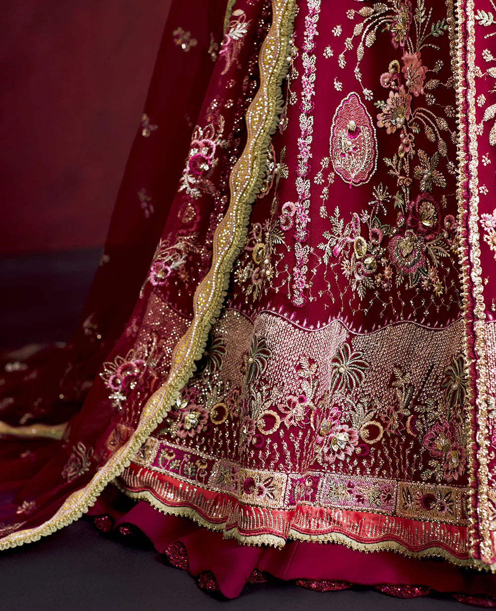 Silene’ glides in with coral hue, it a stunning hot pink paneled pishwas that embodies luxury. Rich lime and coral accents are intricately woven throughout, perfectly harmonizing with the coral pink hues, blooming a sense of tropical paradise. Precise details crafted with lime and cherry threads, add a modern color palette while embroidered satin borders adorned with shimmering sequins elevate the overall look. The sleeves feature delicate floral branches, create a unique and eye catching effect, as if plucked from a whimsical garden. Completing this masterpiece is a net dupatta, trimmed with a beautiful lime satin border to complete this ensemble’s distinguished look.